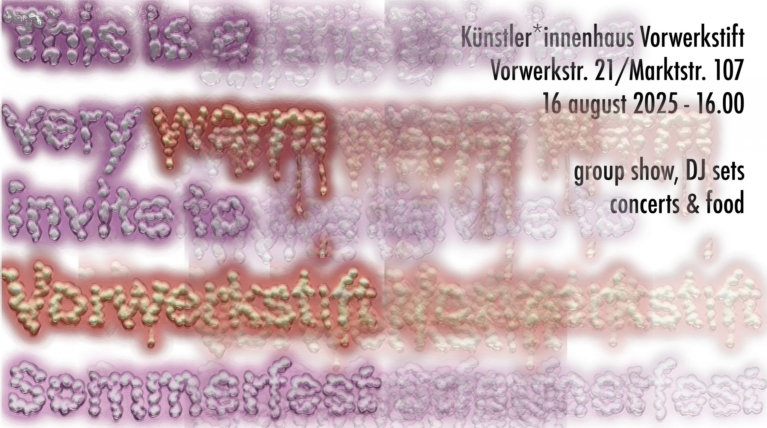 This is a very warm invitation to our Sommerfest. August 16th at 4:00 PM, there will be food, oracles, haircuts, tattoos, an exhibition, and lots of music.